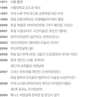 Country (City) of residence: 1996년 이후 현재까지 베를린과 서울을 기반으로 국제 미술무대에서 왕성한 활동 중